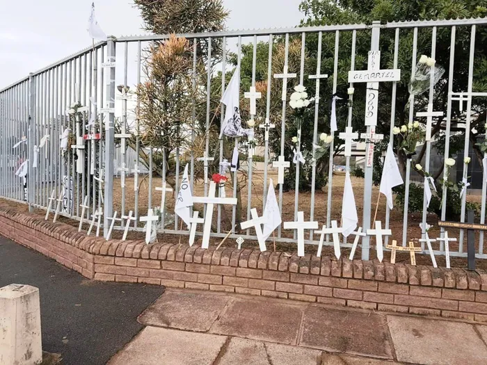 Crosses and flowers decorate a fence after a protest outside Durban Central police station and Durban Magistrate’s Court at the weekend, calling for an end to violence, by the KZN Bikers Against Farm Murders and Racism Movement. Picture: KwaZulu-Natal motorcycle alliance
