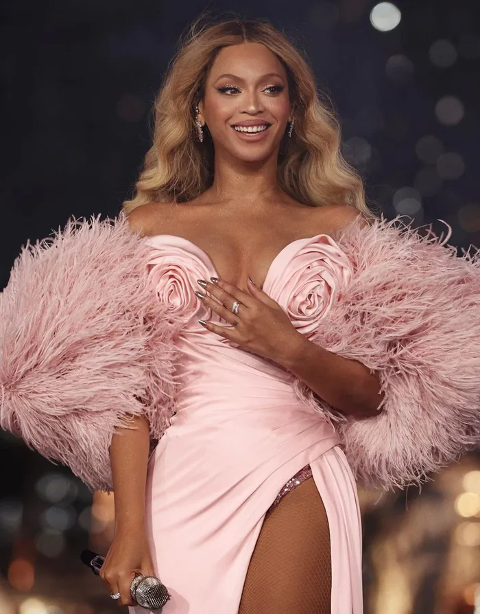 Beyonce smiles in a revealing pale pink evening gown, holding a microphone. Beyoncé. Picture: Instagram