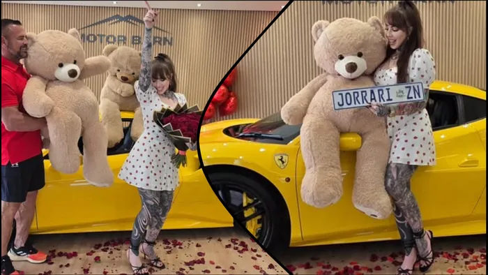 Jojo excitedly revealed on Instagram that her husband spared no expense and, on top of gifting her the new Ferrari 488, he also got her a custom gold and diamond necklace, roses and an oversized teddy bear.