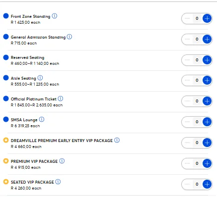 Ticket prices range, with the lowest being R460 for reserved seating and R555 for aisle seating. General admission standing tickets cost R715. Front zone standing tickets cost R1425.