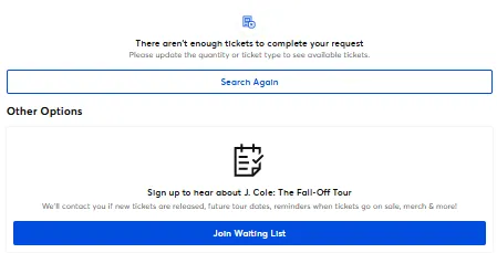 Eager J. Cole fans quickly secured front zone standing, aisle seating, and platinum tickets. On the Ticketmaster website, a waitlist option is currently available, as these tickets can no longer be checked out.