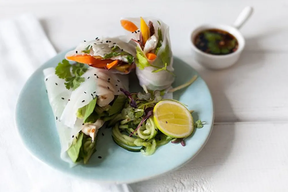 To assemble your wraps, carefully place a rice paper wrap onto a flat surface. Fill with any combination of fish, tofu, chicken, and veggies of your choice. Sprinkle with black sesame seeds and the chopped chilli if you feel like a bit more spice.