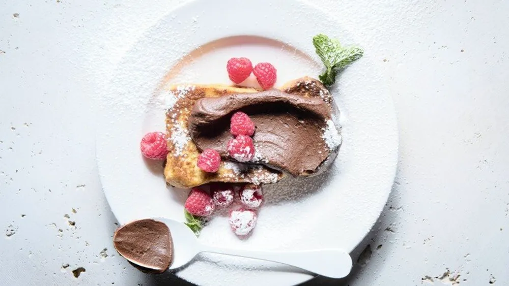 To assemble, place French toast onto a plate. Top with ganache and raspberries, garnish with a sprig of mint and finish off with a dusting of icing sugar.