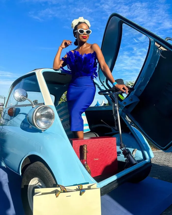 Award-winning fashionista Yaya Mavundla wore a blue maxi dress paired with a white voluminous sleeves shirt, blue bowtie and a white fascinator.