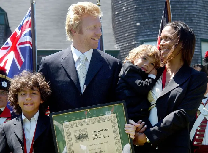 Boris Becker smiles at his ex-wife, Barbara, during a family photo taken after his induction into the International Tennis Hall of Fame in Newport, Rhode Island. Picture: Reuters/Jessica Rinaldi