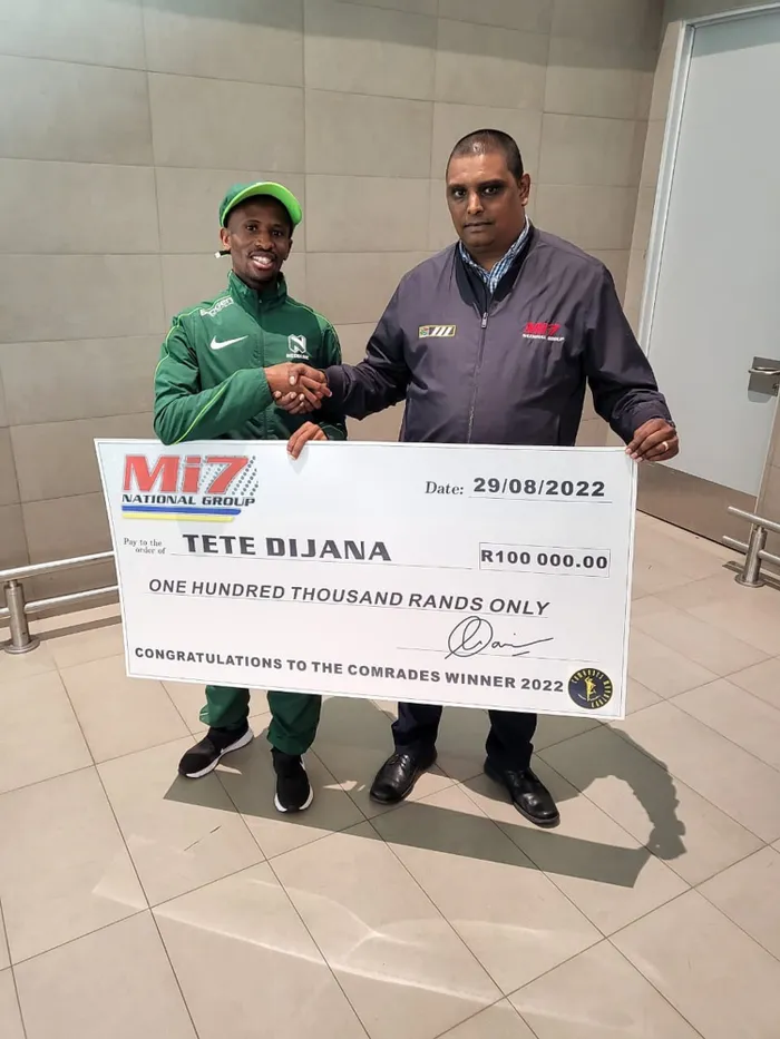 Mi7 National Group said the company and industry are extremely proud of Tete Dijana for winning the 95th edition of the Comrades Marathon on Sunday and rewarded him with a bonus as time off to rest. Comrades Marathon 2022 men’s champion Tete Dijana receives a bonus of R100 000 from his employer, Mi7 National Group. Picture: Supplied.
