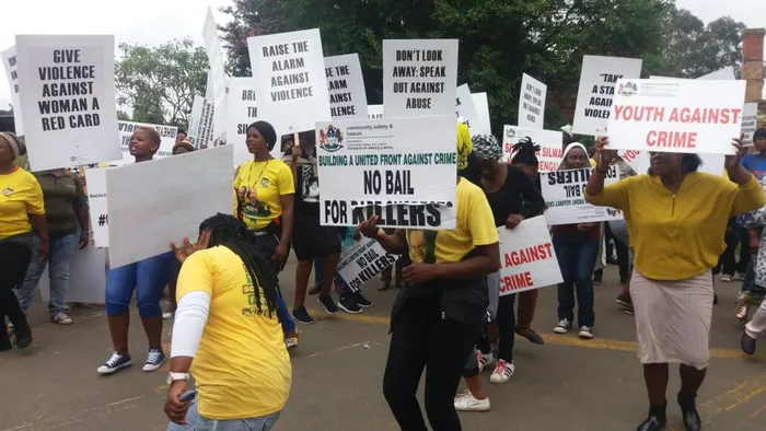 Protesters hold up placards calling for no bail for a man accused of the murder of a 107-year-old woman outside the Howick Magistrate's Court. Picture: Nosipho Mngoma/ANA Protesters hold up placards calling for no bail for a man accused of the murder of a 107-year-old woman outside the Howick Magistrate's Court. Picture: Nosipho Mngoma/ANA