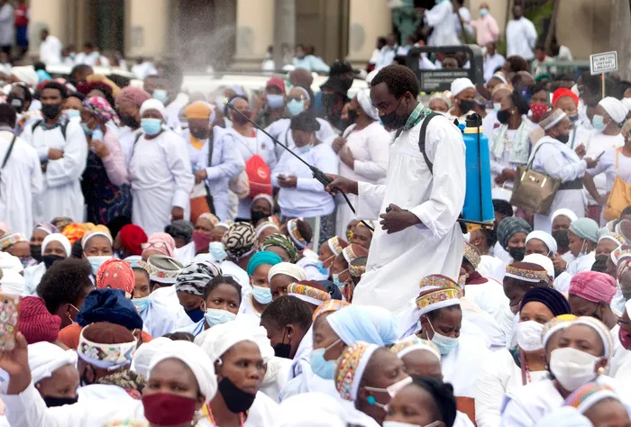 A man sanitises the congregants during the Shembe march in the Durban CBD. Photo: Khaya Ngwenya