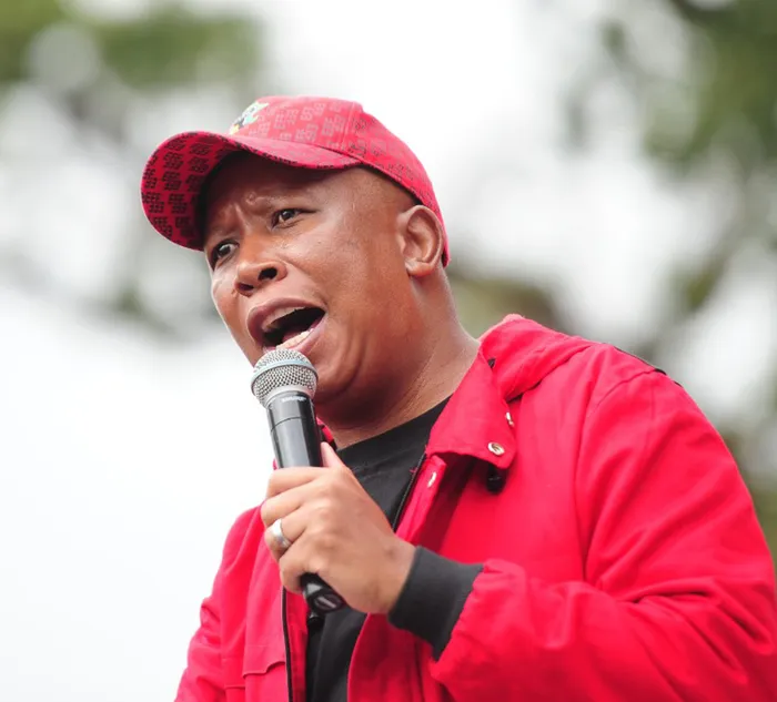South Africa - Cape Town - 6 April 2022 - Leader of the Economic Freedom Fighters Julius Malema is leading a group of EFF supporters who are marching to the Remgro offices in Stellenbosch. The EFF plans to hand over a memorandum to business tycoon Johann Rupert. The action coincides with the day Jan van Riebeeck docked in Cape Town on 6 April 1652. Picture: Henk Kruger African News Agency (ANA)