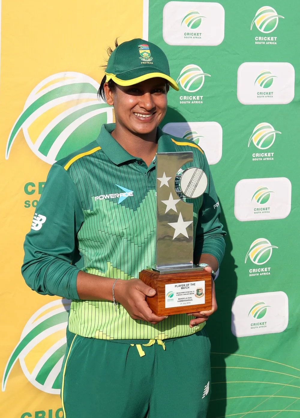 Trisha Chetty of South Africa receives player of the match award during the 2019 1st T20 match between South Africa Women Emerging and Bangladesh Women Emerging at the Mandela Cricket Oval, Hammanskraal on July 31, 2019. Picture: Muzi Ntombela/ BackpagePix