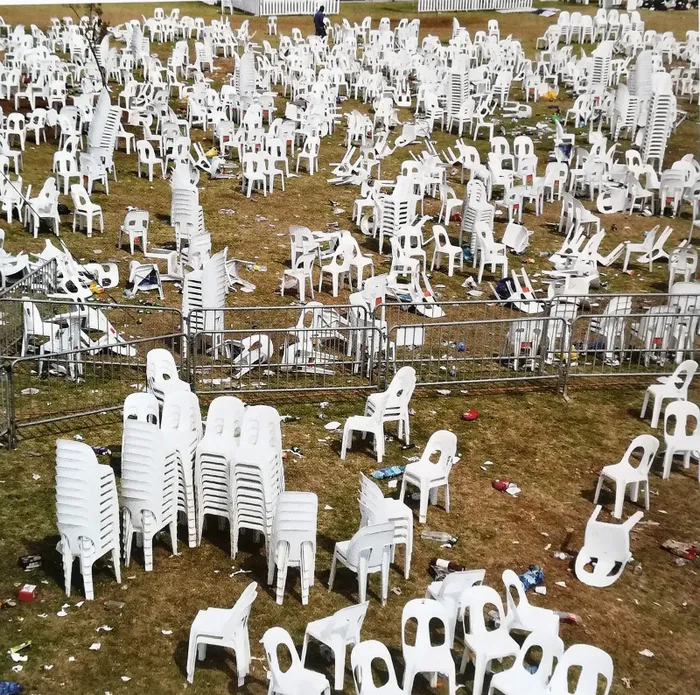 Ezisalayo, Field of white plastic chairs taken by Jabulani Dhlamini in 2019. A sea of beached chairs on a field combines realism and abstraction.