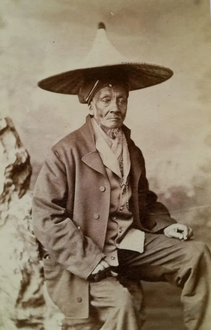 Photo of a carte - de - visite of a Cape Malay Gentleman wearing western clothes with a conical hat, a symbol of his identity, taken circa 1870.