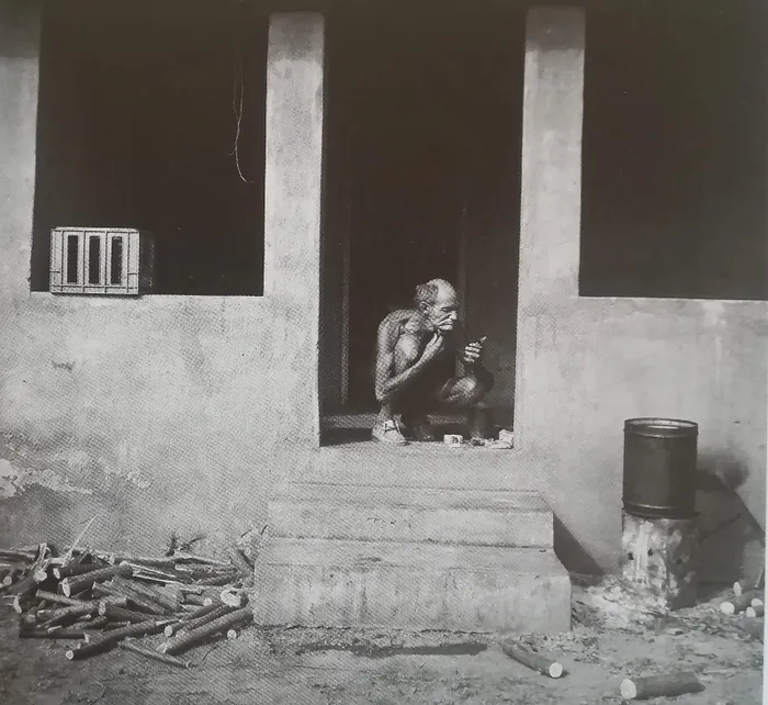 Man shaving on verandah, Western Transvaal photographed by Roger Ballen in 1986. Ballen froze the decay, isolation and faltering existance of the rural dorps (towns) before their extinction.