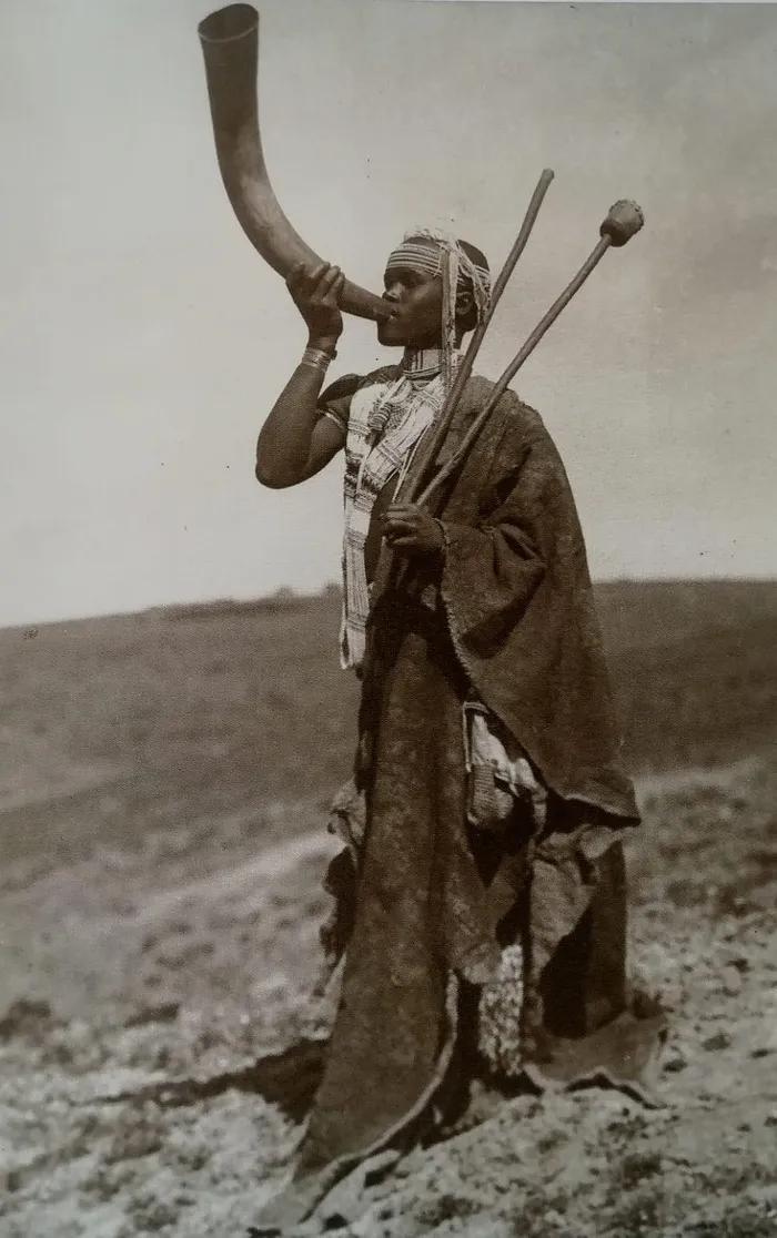 The clarion call to arms photo by Alfred Duggan - Cronin in 1920s in Life Itself: Photography and South Africa. In it a robed warrior adopts a heroic pose with a battle horn.