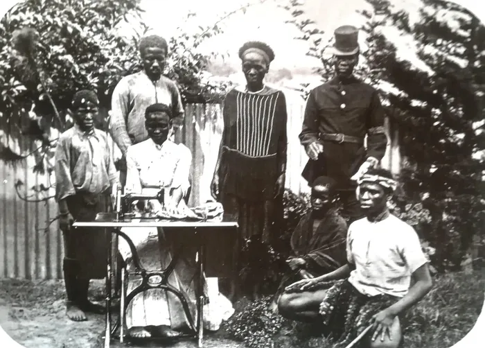Natal Natives and Sewing Machine circa 1900s, photographer unknown. The photo shows a Zulu family who appear to have adopted colonial tropes.