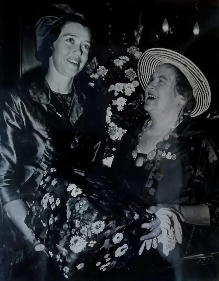 Perla receiving a gift from Mrs Peter Maytom, who acted as Mayoress of Durban when her mother - in - law Margaret Maytom was mayor, 1968.