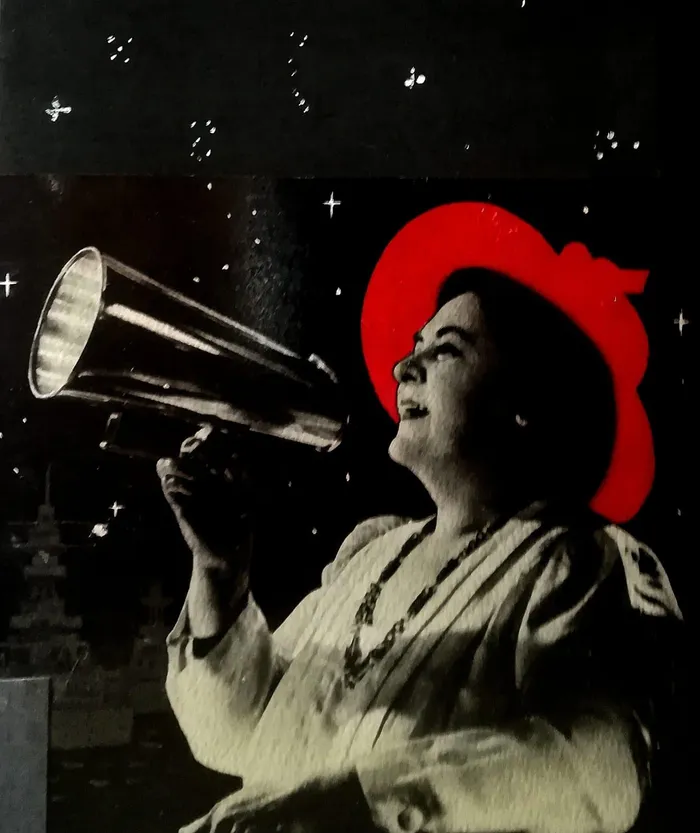 The image of Perla Siedle Gibson which appeared on the cover of her autobiography published in 1964 : white dress, red hat and her megaphone.