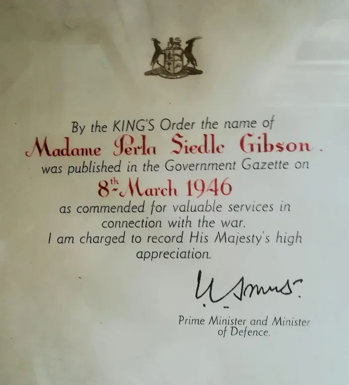 In 1946, Perla Siedle Gibson received a commendation for valuable service during the war from King George VI. The order was signed by the Prime Minister, General Jan Smuts.