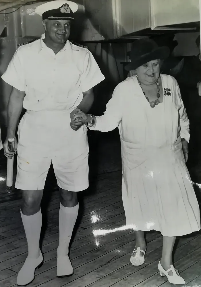 Capt Power, MBE escorts Perla Siedle Gibson on HMS Bulwark on the occasion of her 80th birthday in 1968.
