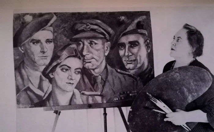Perla Siedle Gibson with a painting she did of her family in uniform: Barrie, Joy, her husband Jack, and Roy.