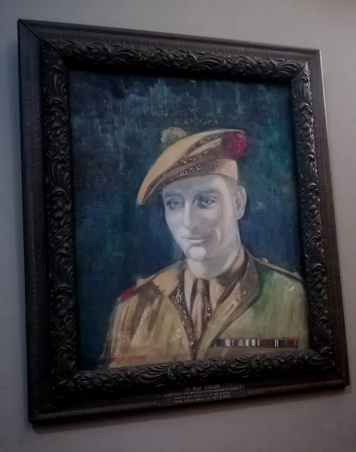 After the war, a plaque in memory of Roy was placed at the Old Fort Chapel beneath that of his uncle Karl. Roy’s brother Barrie unveiled it. Glenwood High School named its boarding establishment Gibson House in his honour. Painting was another of Perla’s skills. She presented a portrait she had painted of her son to the school. It still hangs in Gibson House.