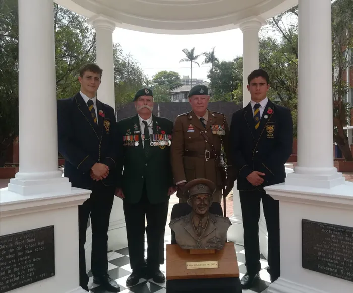 Head Prefect 2025 Kirk Wilson, Colonel Pat Acutt, Lieutenant Colonel Greg de Ricquebourg and Head Prefect 2026 Zion Smith standing in the Delville Wood dome with the bust of Captain Edwin Swales VC at Durban High School on Wednesday, November 12, when the school held their Remembrance service.
