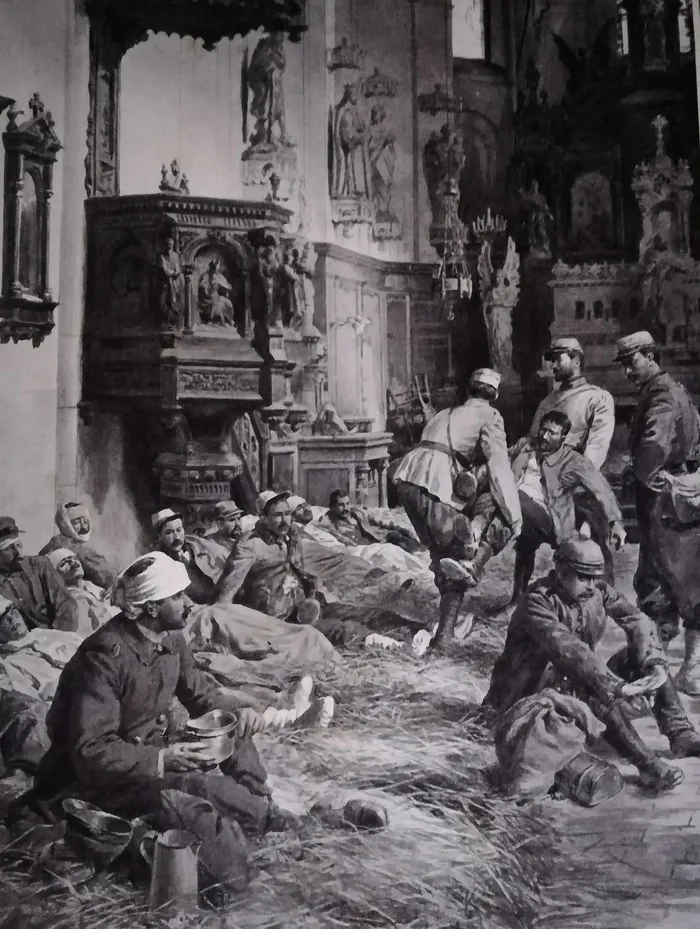 A church close to the front lines is used by the French Red Cross to care for the wounded, 1915.