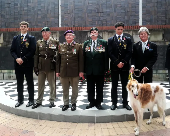 Kirk Wilson (Head Prefect 2025), Lt Col Greg de Ricquebourg (Durban Light Infantry), Father Dane Elsworth, Colonel Pat Acutt (Natal Mounted Rifles), Zion Smith (Head Prefect 2026), and Alan Yates with his borzoi dog at the Durban High School Memorial Wall.