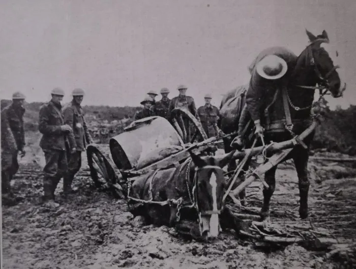 An exhausted horse collapses trying to pull a water cart in Flanders in September 1917.