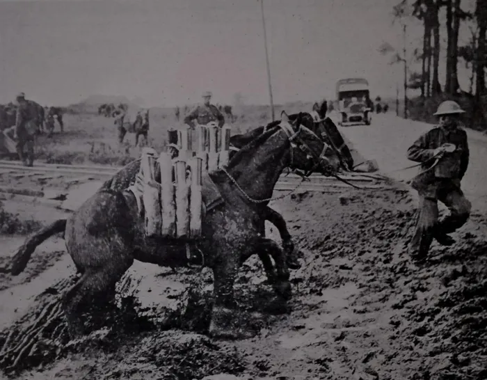 A pair of ammunition pack horses struggle through the mud with their load of shells in September 1917.