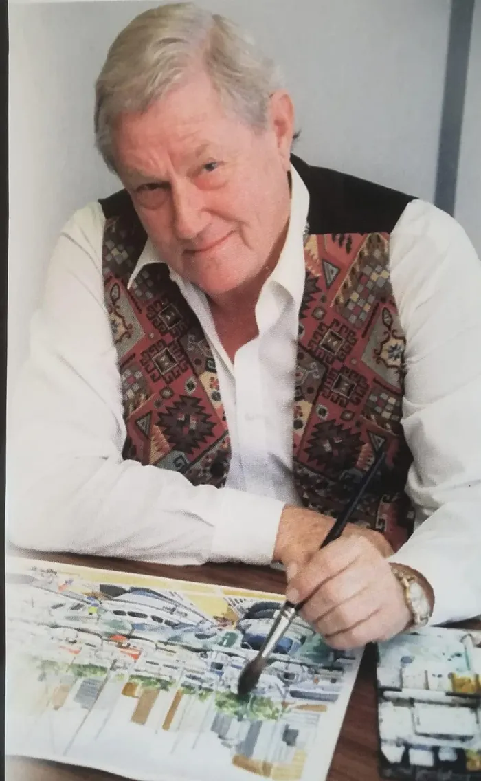 Napier Dunn in 1998 working on his sketch of the Durban Yacht Basin.