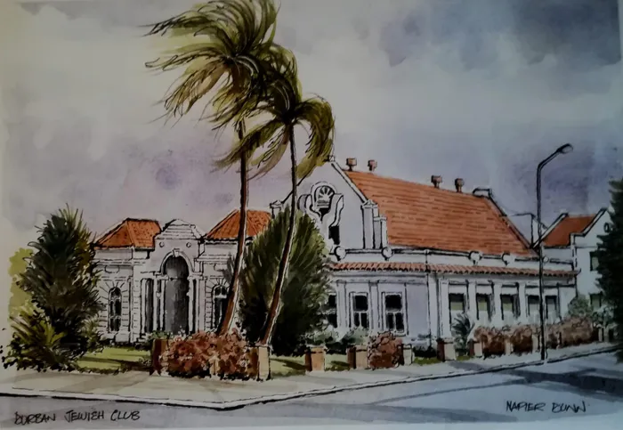 The Durban Jewish Club was opened in 1931. Sketched in the late 1990s before the lawn was paved over for parking and the erection of a security fence.