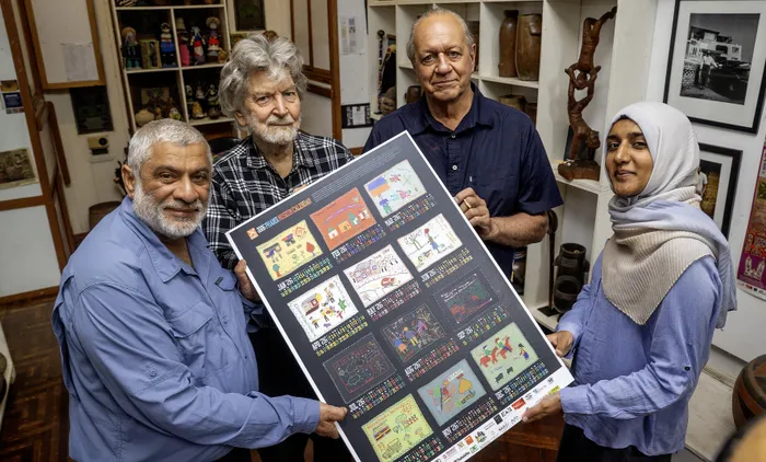 Artists and cultural custodians Yusuf Patel, Paul Mikula, Andries Botha and Fathima Paruk with the Phansi Museum’s 2026 calendar, celebrating women’s voices and living heritage.