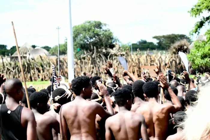 YOUNG Zulu regiments at the First Fruits Festival in eMashobeni Royal Palace in oPhongolo, northern KwaZulu-Natal where King Misuzulu kaZwelithini made a rare and brief public appearance after weeks of ritual isolation. The festival heralds the harvest season with the blessing of the Zulu King.