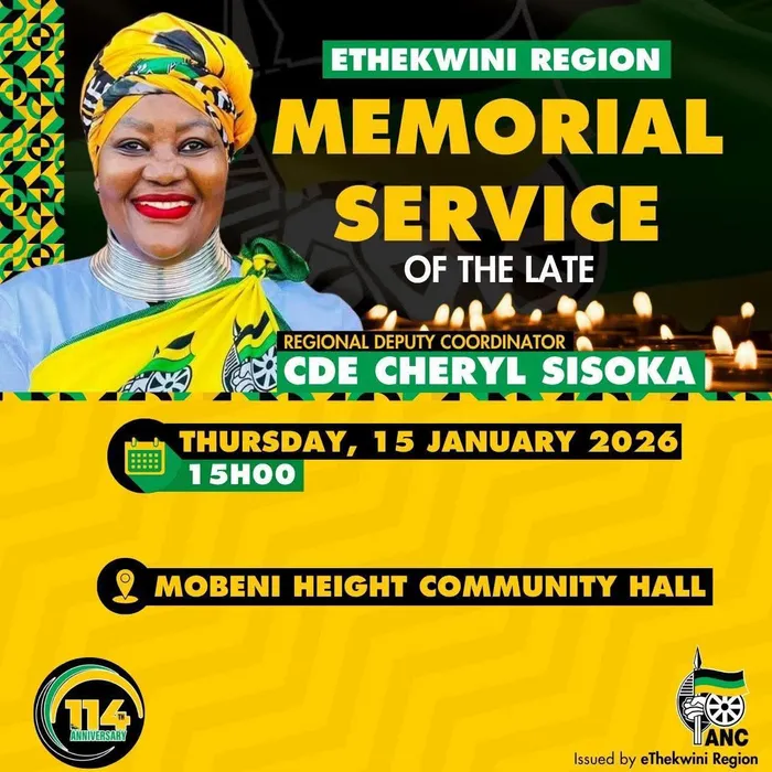 EThekwini Mayor Cyril Xaba and the ANC mourn the loss of councillor Cheryl Sisoka, 53, whose passing was announced on Tuesday. She was the eThekwini Region Task Team Deputy Coordinator. Her memorial service will be held on Thursday afternoon at Mobeni Heights Community Hall.