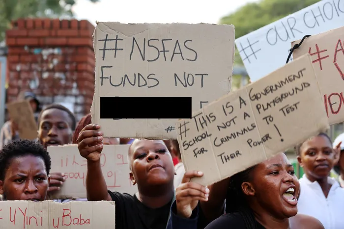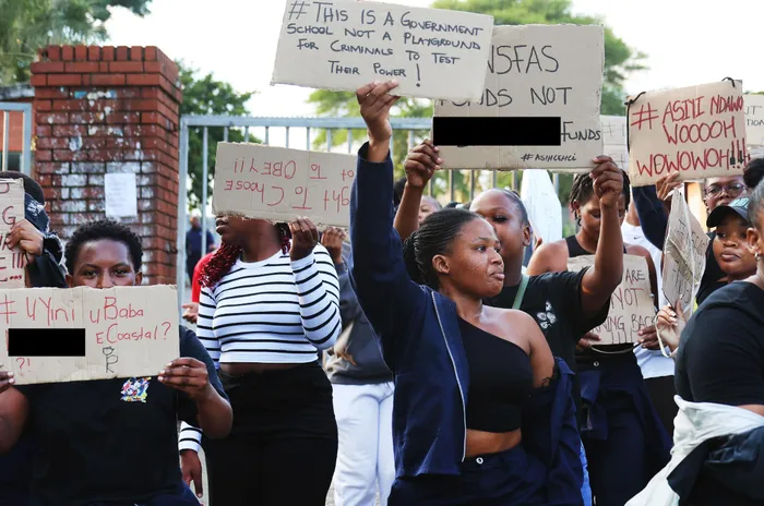 Coastal KZN TVET College students at the uMlazi V-section campus carrying placards in their protest over unaddressed concerns about power and water outages, security issues and unreliable Wi-Fi at a student accomodation they are being forced to move into in the south Durban township.