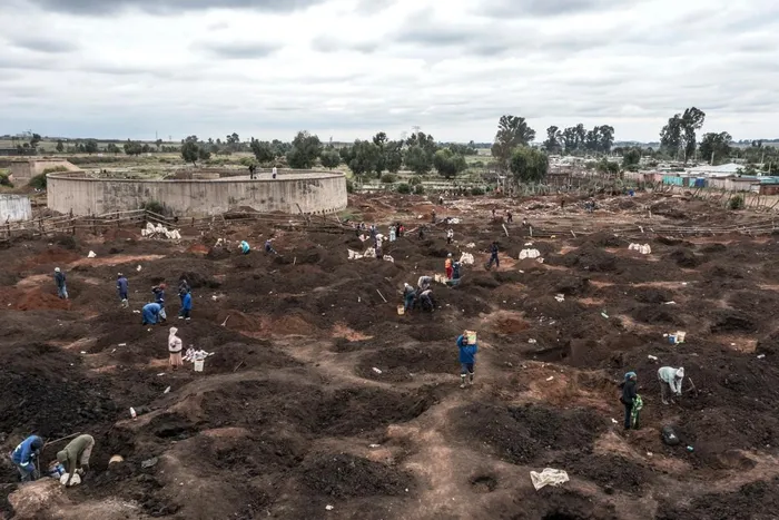 This aerial view shows artisanal miners digging holes as they look for gold in a patch of land outside Springs, Ekurhuleni, on February 15, 2026. This land, riddled with holes dug with pickaxes, was just a week ago a cattle pen. Barbed wire still bears witness to this. This patch of land in a Springs township is now attracting gold prospectors from the surrounding area.