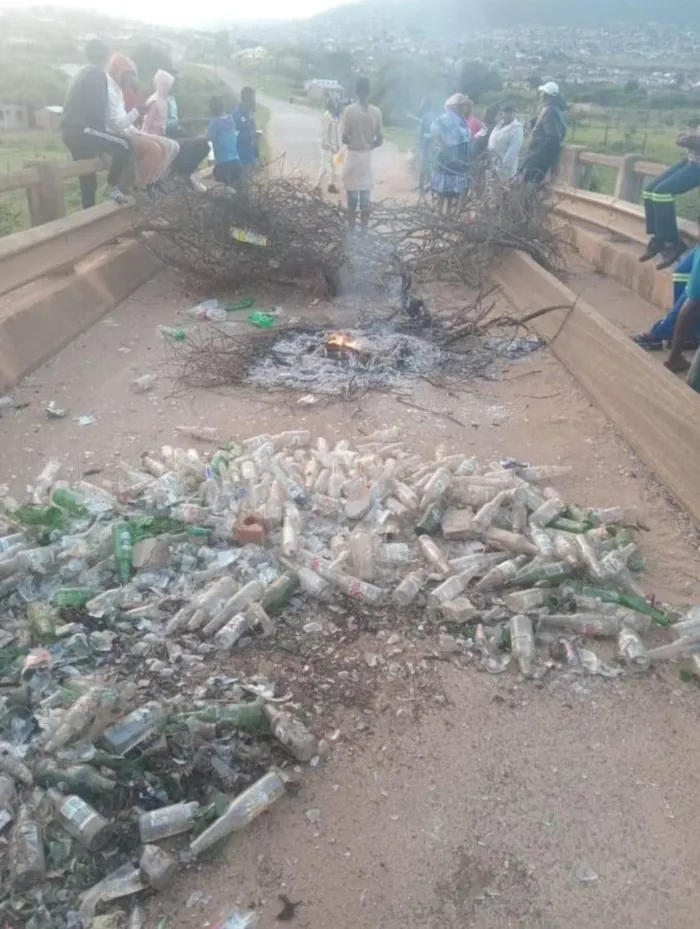 Old empty bottles and garbage were strewn across one of the bridges that links the KwaXimba, near Cato Ridge, to the main road when protesters took to the streets complaining about their ward councillor Thembo Ntuli.