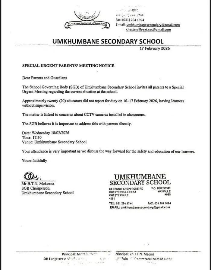 The notice of an urgent parents meeting from the uMkhumbane Secondary School in Mayville, Durban, following a teachers' boycott which halted learning and teaching at the school this week.