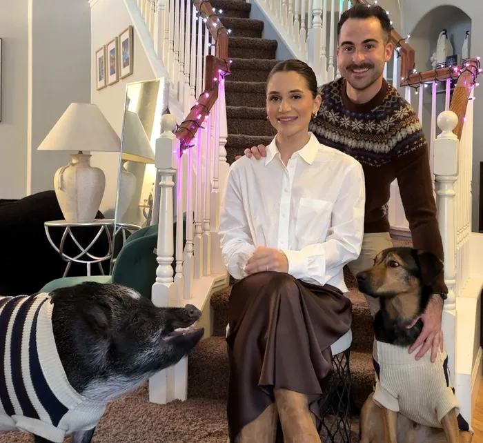 Alali with her fiancé, Alex Saraceno, Merlin the pig and Maverick the dog.