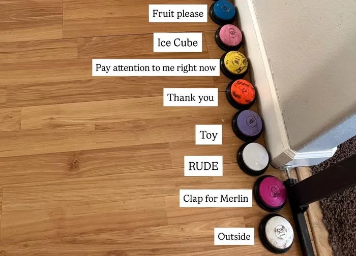 Around the same time, Alali added a white button that said “outside.” Alali put on Merlin’s harness and leash before pressing the button to show him he could click it to use the bathroom outside, dig in the dirt or search the grass for food. Another button said “water,” which prompted Alali to fill Merlin’s water bowl.