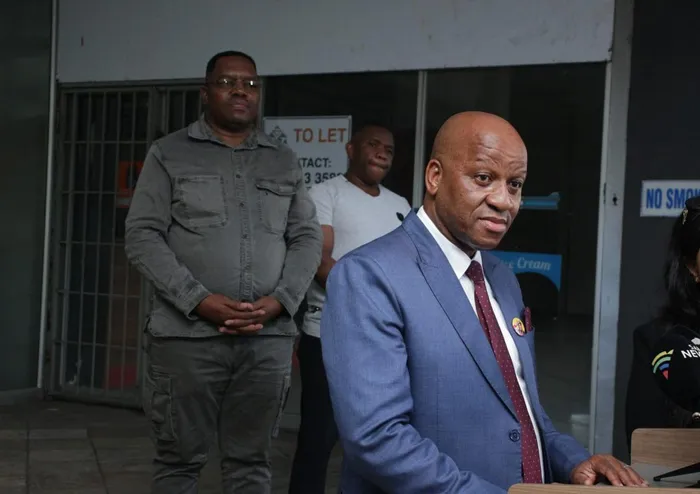 KwaZulu-Natal Premier Thami Ntuli addresses the media following the contract renewal of KwaZulu-Natal Police Commissioner Lieutenant-General Nhlanhla Mkhwanazi as provincial police commissioner. Back: SAPS Commissioner General Fannie Masemola and Mkhwanazi.