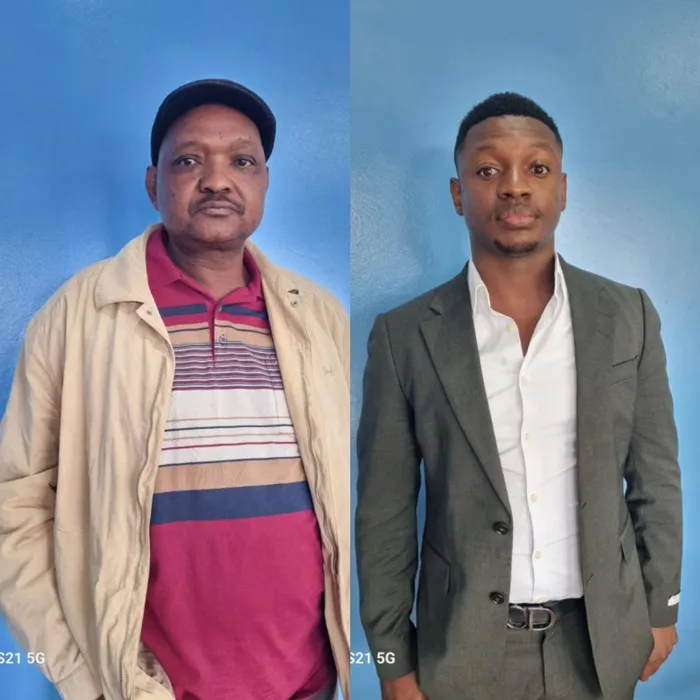 Two men standing Two accused men, Mtau Dony Mmathinyane, 31, the sole director of Dibuseng Business Enterprise and Maphoto Manape Sylvane Mokgadi, 55, were released on bail after they were arrested by the Hawks in Mpumalanga. Picture: Hawks