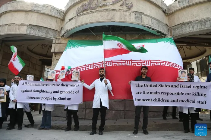 Medical workers participate in a rally in front of a hospital damaged in a U.S.-Israeli strike, in Tehran, Iran, March 7, 2026. The hospital in northern Tehran was damaged in a U.S.-Israeli strike on the night of March 1. On Saturday, Iranian medical workers rallied in front of the hospital to protest against U.S.-Israeli strikes on Iranian hospitals.