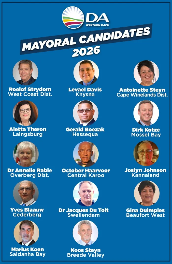 The Mayoral Candidates announced today are: Breede Valley - Koos Steyn, Cederberg - Yves Blaauw, Mossel Bay - Dirk Kotzé, Saldanha Bay - Marius Koen, Swellendam - Dr Jacques Du Toit, and West Coast District - Roelof ‘Boffie’ Strydom.