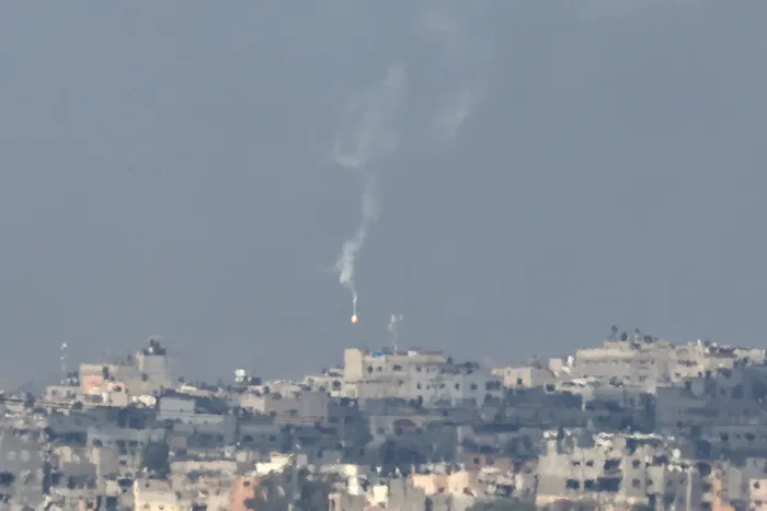 A flare falls over Gaza, amid the ongoing war in Palestine. Picture: Reuters/Athit Perawongmetha
