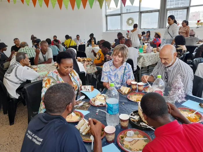 Mikaela York (seated in the middle) is the niece of Archbishop Denis Hurley who was a great inspiration to Rev Mike Vorster (seated on the right of her) as a fearless religious leader. She is seen attending the Meal of Reconciliation at the Denis Hurley Centre where both she and Vorster are patrons.