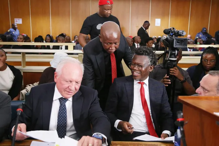 ECONOMIC Freedom Fighters (EFF) leader Julius Malema (centre) consults with his legal representatives Laurance Hodes SC (left) and Thembeka Ngcukaitobi SC at the KuGompo Regional Court on Thursday.