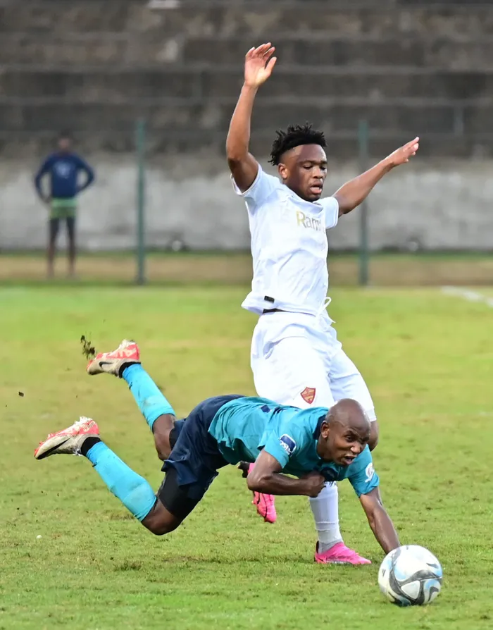 SANELE Barns of Richards Bay FC being tackled during the DStv Premiership 2023/24 football match against Stellenbosch. | BackpagePix