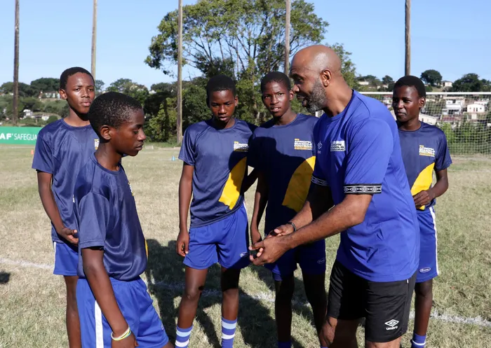 LUCAS Radebe, here with the kids during the 2023 CAF African Schools Football Championship Legends CSI at the Christianenburg Ground in Clermont, remains a huge Leeds United fan and legend. | BackpagePix